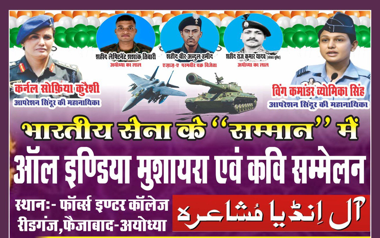 आल इंडिया मुशायरा एवं कवि सम्मेलन का जारी पोस्टर जनमानस में खासी चर्चा का विषय बना हुआ है। पोस्टर में शहीद अयोध्या का लाल शहीद लेफ्टिनेंट शशांक तिवारी, परमवीर चक्र विजेता शहीद वीर अब्दुल हमीद, अयोध्या के लाल शहीद राजकुमार यादव के साथ पुलवामा अटैक के बाद सर्जिकल स्ट्राइक आपरेशन सिंदूर का नेतृत्व करने वाली कर्नल सोफिया कुरैशी और विंग कमांडर व्योमिका सिंह की तस्वीर लगी है।