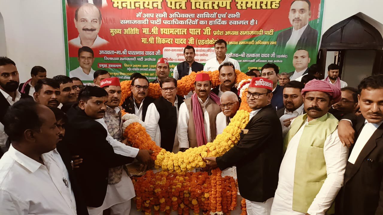 अयोध्या। समाजवादी पार्टी कार्यालय लोहिया भवन गुलाबबाड़ी में शनिवार को सपा जिला अध्यक्ष पारसनाथ यादव की अध्यक्षता में अधिवक्ता सभा द्वारा आयोजित मनोनयन पत्र वितरण समारोह में मुख्य अतिथि के रूप में समाजवादी पार्टी के प्रदेश अध्यक्ष श्यामलाल पाल शामिल हुए। प्रदेश अध्यक्ष श्याम लाल पाल ने नव-निर्वाचित पदाधिकारियों को मनोनयन प्रमाण पत्र वितरित किया।