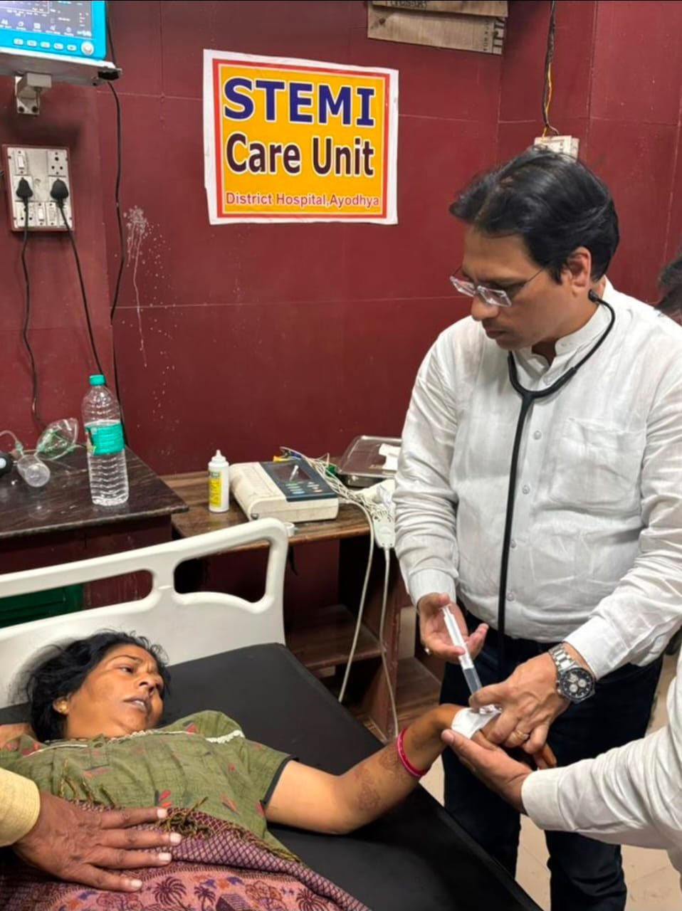 इमरजेंसी ड्यूटी पर तैनात डा. वीरेन्द्र वर्मा ने परीक्षण कर ईसीजी किया। ईसीजी में हृदघ्याघात हार्ट अटैक की पुष्टि होने पर डा राम मनोहर लोहिया की स्टेमी केयर यूनिट से सम्पर्क कर टेक्नोप्लेस दिया और लखनऊ के जाने की सलाह दी।