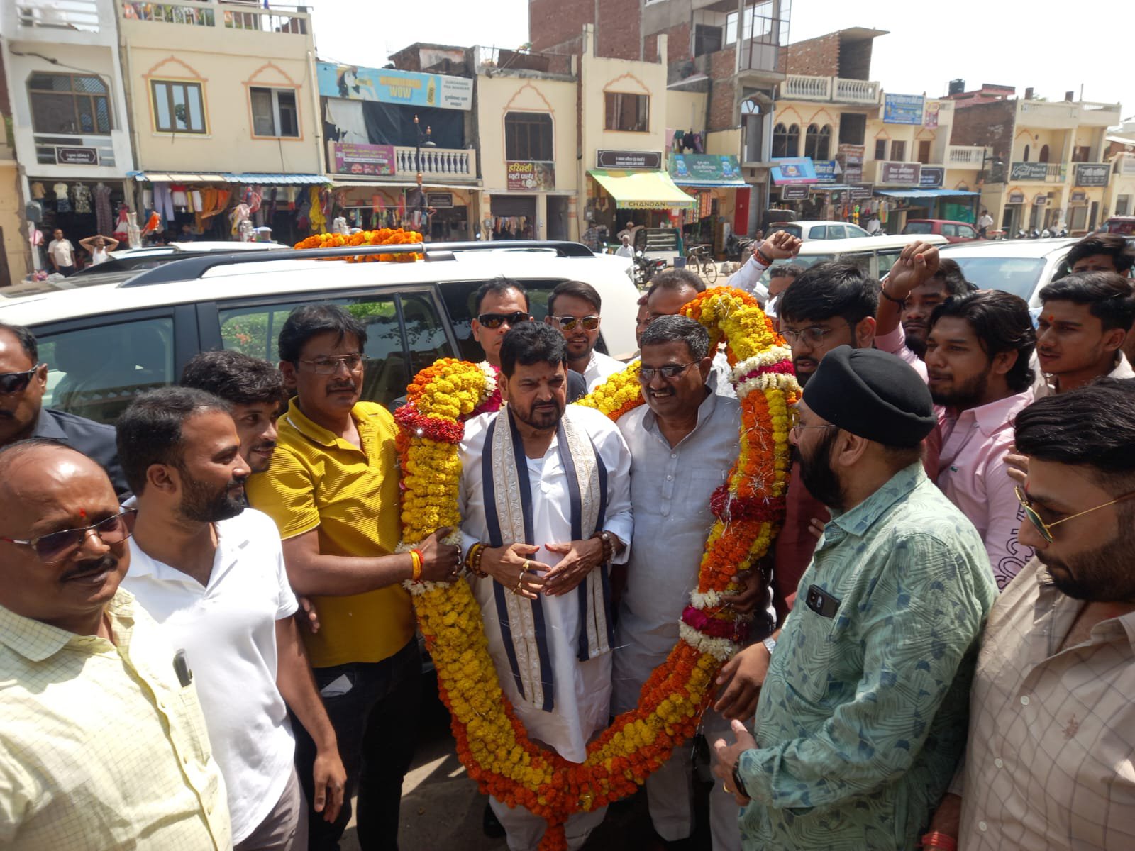अयोध्या। पूर्व सांसद बृजभूषण शरण सिंह सोमवार को अयोध्या पहुंचे, जहां सहादतगंज क्षेत्र में भारतीय जनता पार्टी के नेताओं द्वारा उनका स्वागत किया गया। इस दौरान भाजपा नेता मनोज श्रीवास्तव के नेतृत्व में उन्हें इक्यावन किलो की माला पहनाकर तथा स्मृति चिन्ह भेंट कर अभिनंदन किया गया। कार्यक्रम में स्थानीय कार्यकर्ताओं और समर्थकों की बड़ी संख्या मौजूद रही।