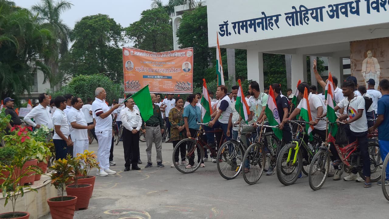 अयोध्या। डॉ. राममनोहर लोहिया अवध विश्वविद्यालय में कुलाधिपति एवं राज्यपाल उत्तर प्रदेश श्रीमती आनंदी पटेल की प्रेरणा से कुलपति कर्नल डॉ. बिजेंद्र सिंह के नेतृत्व में साइकिल यात्रा जागरूकता अभियान चलाया गया। लगभग 150 छात्र-छात्राओं द्वारा 25 किलोमीटर की साइकिल यात्रा जागरूकता अभियान को हरी झंडी दिखाकर कुलपति ने रवाना किया। कुलपति ने कहा कि सभी का जीवन पर्यावरण हितैषी बने यही सुखद भविष्य का आधार है।