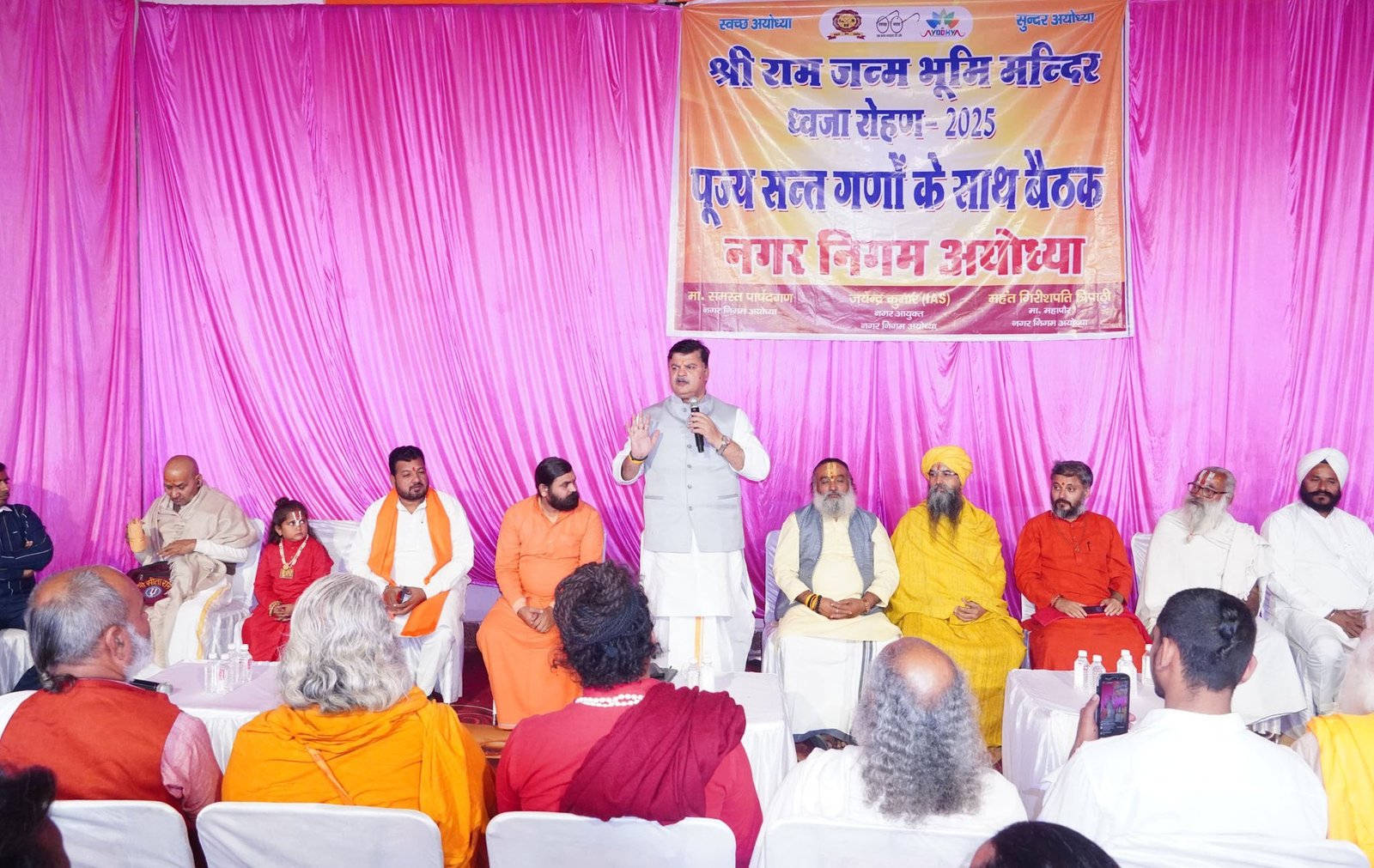 महापौर महंत गिरीशपति त्रिपाठी ने कहा कि अयोध्या ने स्वच्छता के मामले में आशातीत प्रगति की है। प्रधानमंत्री के आगमन को देखते हुए अयोध्या धाम को स्वच्छ बनाने में संतों के विशेष सहयोग की आवश्यकता है। उन्होंने स्वच्छता अभियान से धार्मिक वातावरण बनाने का आह्वान किया। नगर आयुक्त जयेंद्र कुमार ने नगर निगम के स्वच्छता अभियान की रूपरेखा प्रस्तुत की। बैठक का संचालन अपर आयुक्त नागेंद्र नाथने किया।