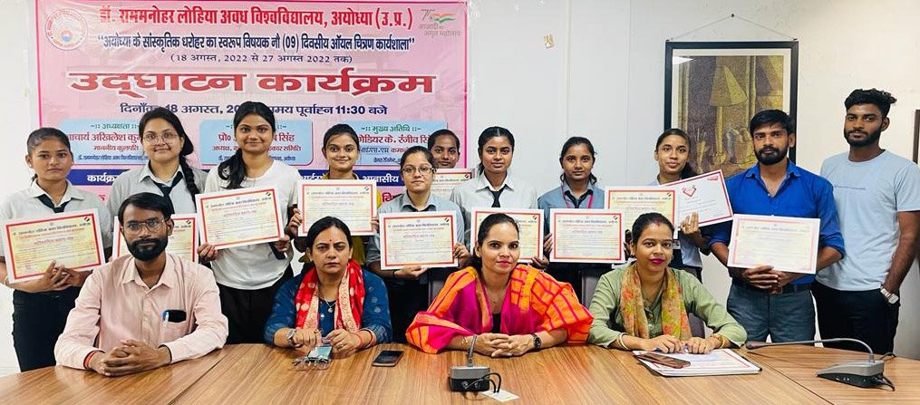 अयोध्या। डॉ. राममनोहर लोहिया अवध विश्वविद्यालय के फाइन आर्ट्स विभाग तथा अर्थशास्त्र एवं ग्रामीण विकास विभाग के संयुक्त संयोजन में चल रही नौ दिवसीय ऑयल चित्रण कार्यशाला का समापन शनिवार को किया गया। इसमें छात्र-छात्राओं ने अपनी कलाकृतियों को अंतिम स्वरूप प्रदान किया। फाइन आर्ट्स विभाग के समन्वयक प्रो0 विनोद कुमार श्रीवास्तव ने बताया कि अयोध्या के पौराणिक धरोहर को सृजित करने संबंधी चित्रण कार्यशाला के अंतिम दिन छात्र-छात्राओं द्वारा निर्मित चित्रों को सुचारू रूप से चित्रित किया गया।
