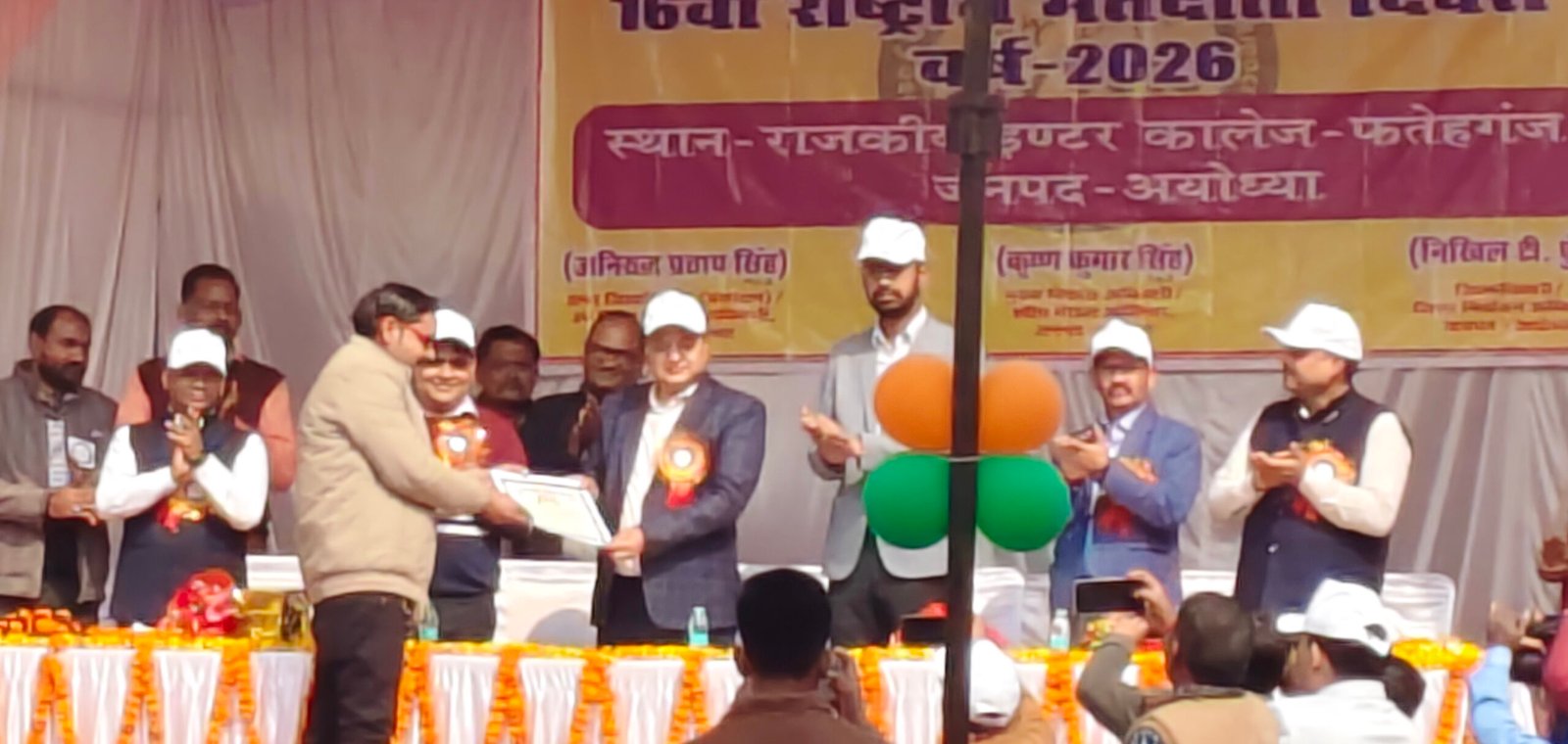 अयोध्या। भारत निर्वाचन आयोग के निर्देशानुसार 25 जनवरी, 2026 को 16वां राष्ट्रीय मतदाता दिवस का आयोजन जिलाधिकारी निखिल टीकाराम फुंडे की अध्यक्षता में राजकीय इण्टर कालेज, अयोध्या में आयोजन किया गया, जिसमें जिलाधिकारी द्वारा 85 वर्ष से अधिक आयु वर्ग के श्रीमती कलावती, श्रीमती गुडडी वर्मा, रफीक, चौतराम एवं भगवानदास को साल भेंट करते हुए माल्यार्पण कर सम्मानित किया गया तथा 18 वर्ष के युवा मतदाताओं को जो पहली बार मतदाता बन रहे हैं को मतदाता पहचान पत्र बैज एवं टोपी लगाकर सम्मानित किया गया, जिसमें साधना विश्वकर्मा, कुमारी तान्या चौरसिया, चाँदनी एवं अनुष्का उपस्थित रहीं।