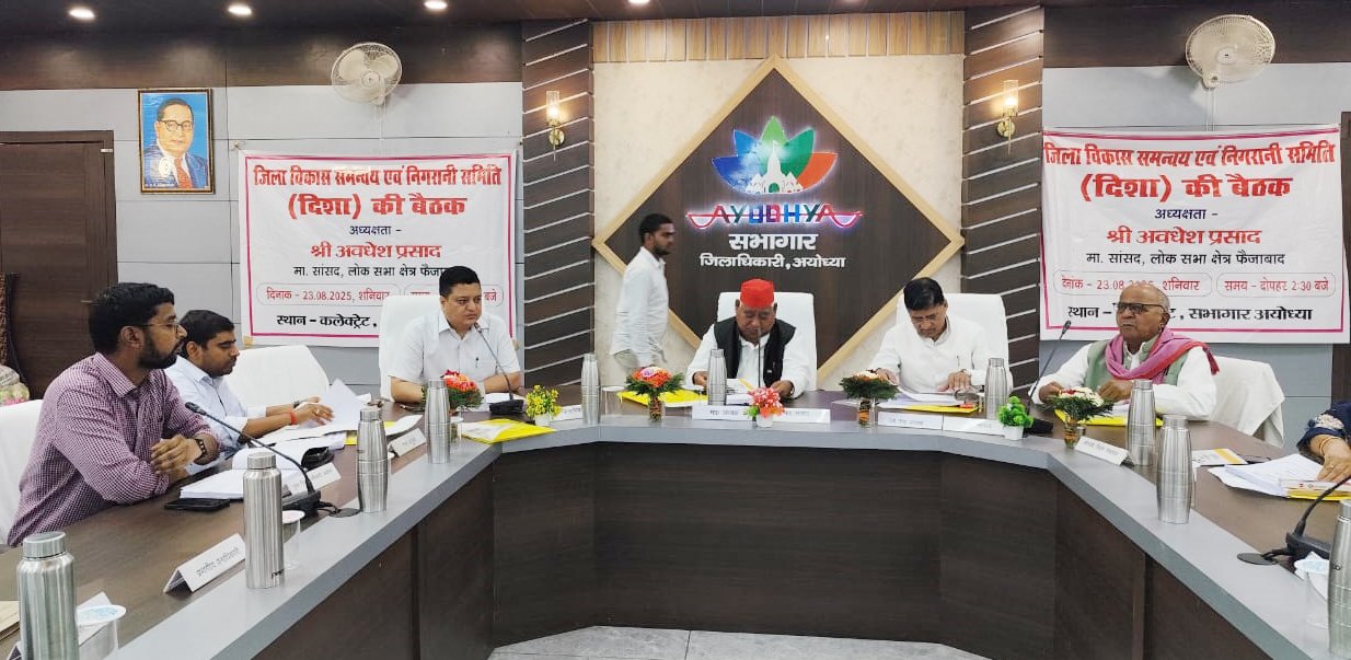 अयोध्या। जिला विकास समन्वय एवं निगरानी समिति (दिशा) की बैठक फैजाबाद सांसद अवधेश प्रसाद की अध्यक्षता में कलेक्ट्रेट सभागार में आयोजित की गयी। बैठक में सांसद के साथ-साथ अम्बेडकरनगर लोकसभा सांसद लालजी वर्मा, विधान परिषद सदस्य राज्य स्तर से नामित एमएलसी बलराम यादव, जिला पंचायत अध्यक्ष श्रीमती रोली सिंह, विधायक रुदौली रामचन्द्र यादव, विधायक मिल्कीपुर चन्द्रभान पासवान, विधायक बीकापुर अमित सिंह चौहान, जिलाधिकारी निखिल टीकाराम फुंडे, नगर आयुक्त जयेंद्र कुमार शर्मा, मुख्य विकास अधिकारी कृष्ण कुमार सिंह सहित अन्य जनप्रतिनिधि व संबंधित विभाग के अधिकारीगण उपस्थित रहे। सांसद ने बैठक की अध्यक्षता करते हुए सर्वप्रथम वहां उपस्थित सभी अधिकारियों का परिचय लिया गया तत्पश्चात पूर्व बैठक के कार्यवृत्त अनुपालनीय बिंदुओं पर समीक्षा की गयी।