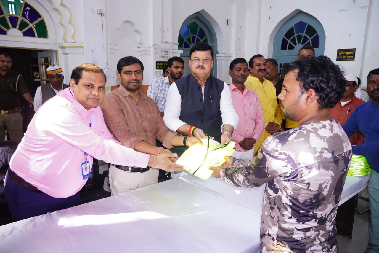 अयोध्या। नगर निगम अयोध्या के तिलक हाल में 200 कर्मचारियों को ठंड से बचाव के लिए महापौर महंत गिरीशपति त्रिपाठी ने नगर आयुक्त श्रीजयेंद्र कुमार के साथ जैकेट का वितरण किया। इस दौरान महापौर ने स्टेट बैंक ऑफ़ इंडिया का इस सहयोग के लिए आभार जताया। कार्यक्रम में 200 सफाई कर्मियों को जाकर उपलब्ध कराया गया।